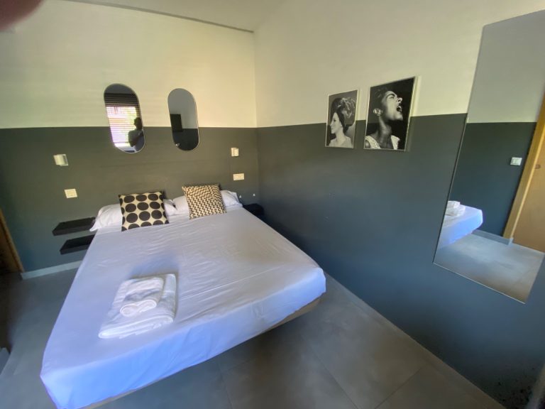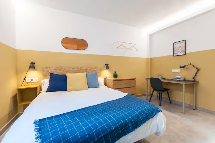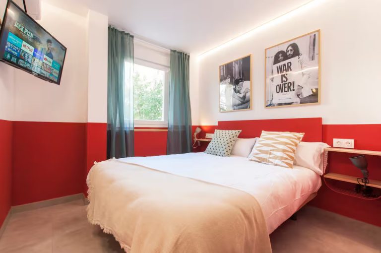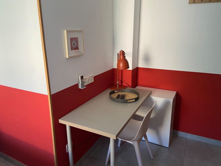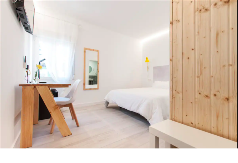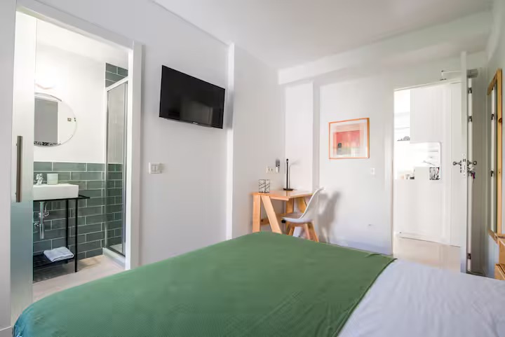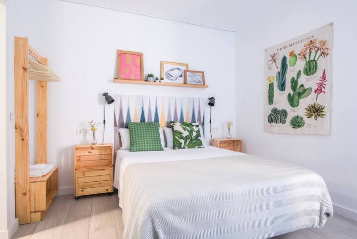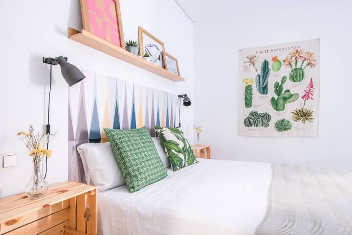 Spacious and quiet room featuring a queen bed, private bathroom, desk, A/C, and Smart TV. Enjoy access to a fully equipped shared kitchen, a dining space, and a terraze.