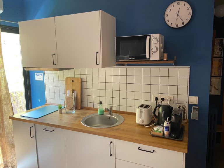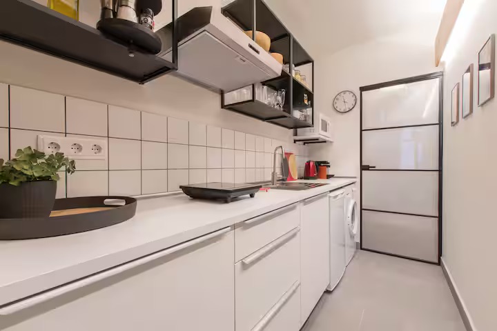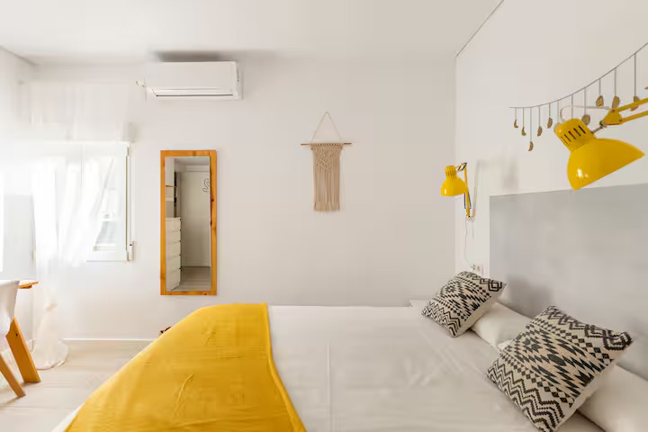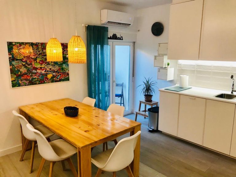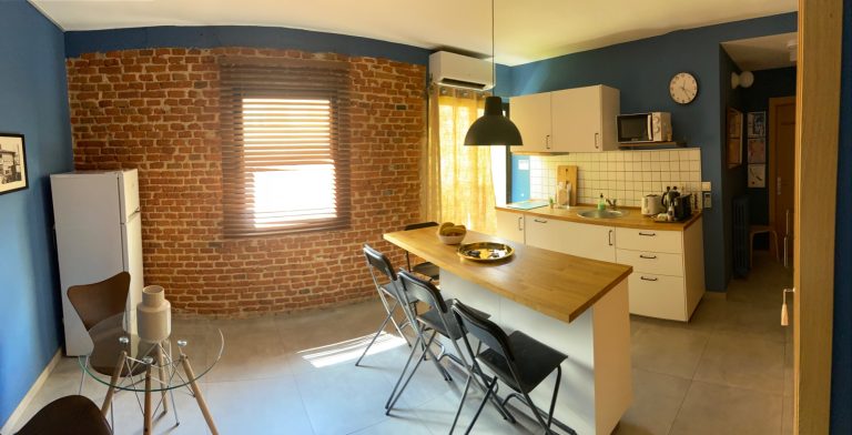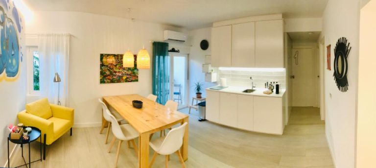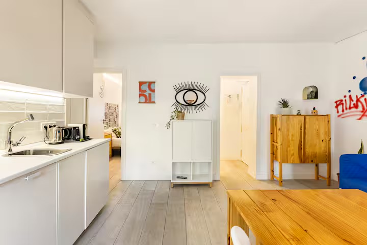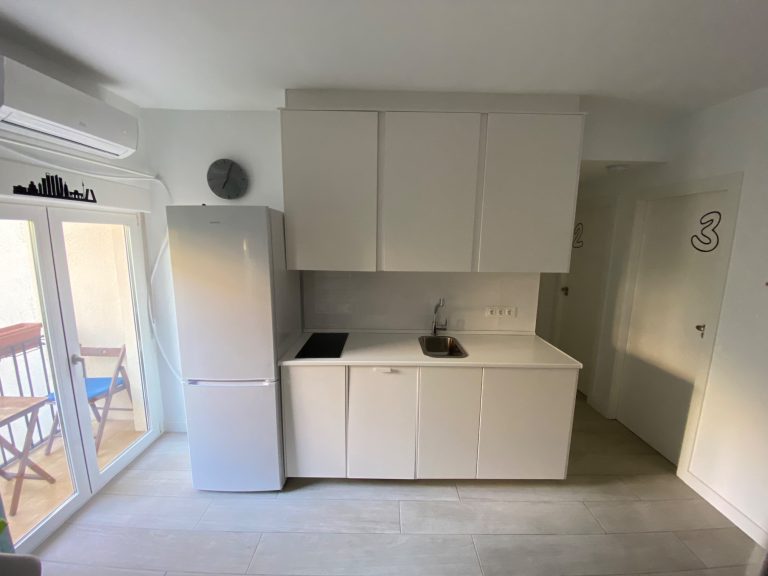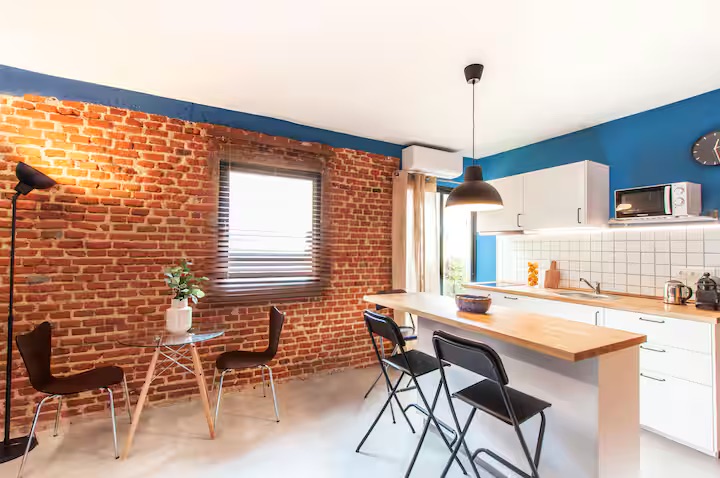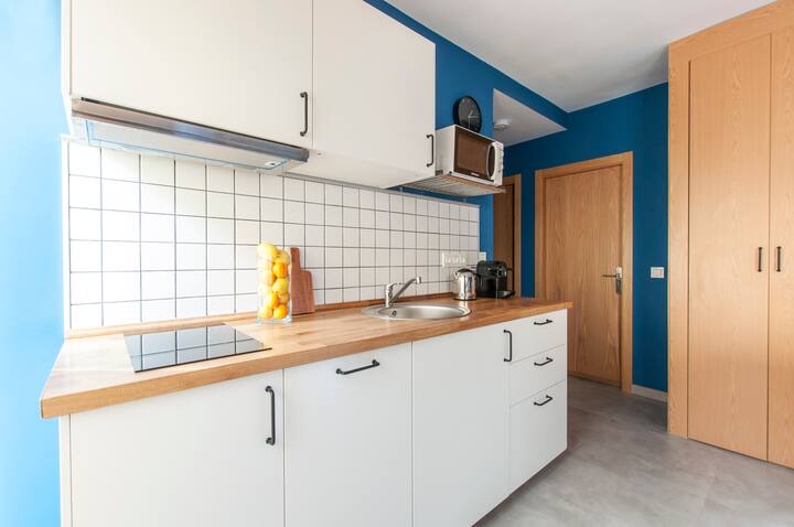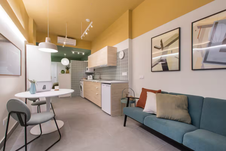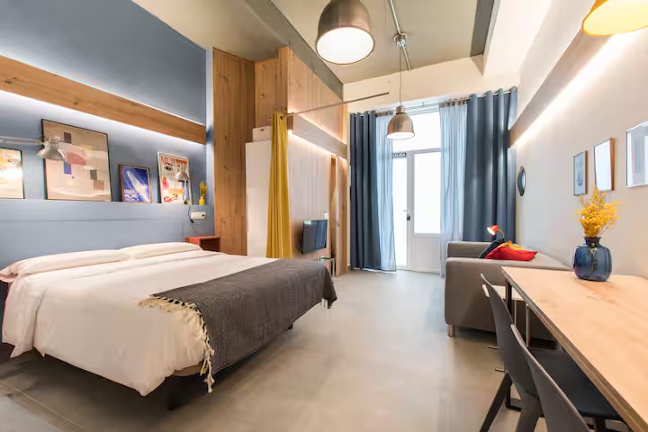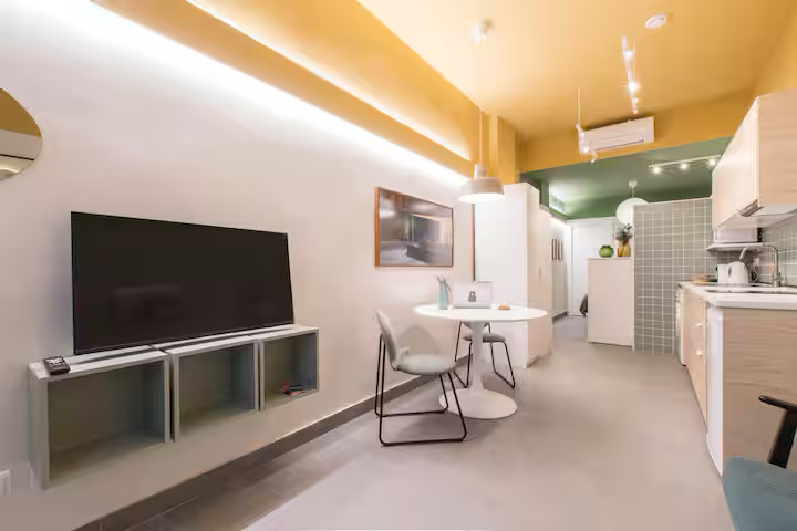 New, stylish, and fully equipped studio apartment with direct street access. Features a queen bed, private bathroom, full kitchen, dining table, cozy lounge area, and Smart TV.