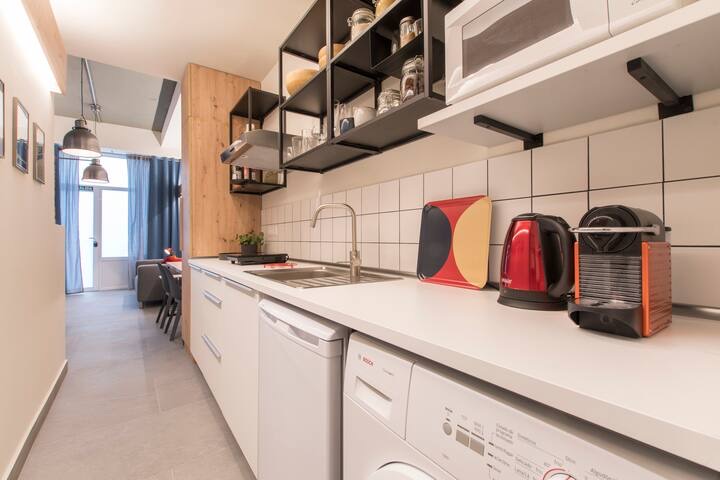 Industrial look and convenient apartment with direct street access, featuring a queen bed, private bathroom, full kitchen, dining table, cozy lounge area, and Smart TV.